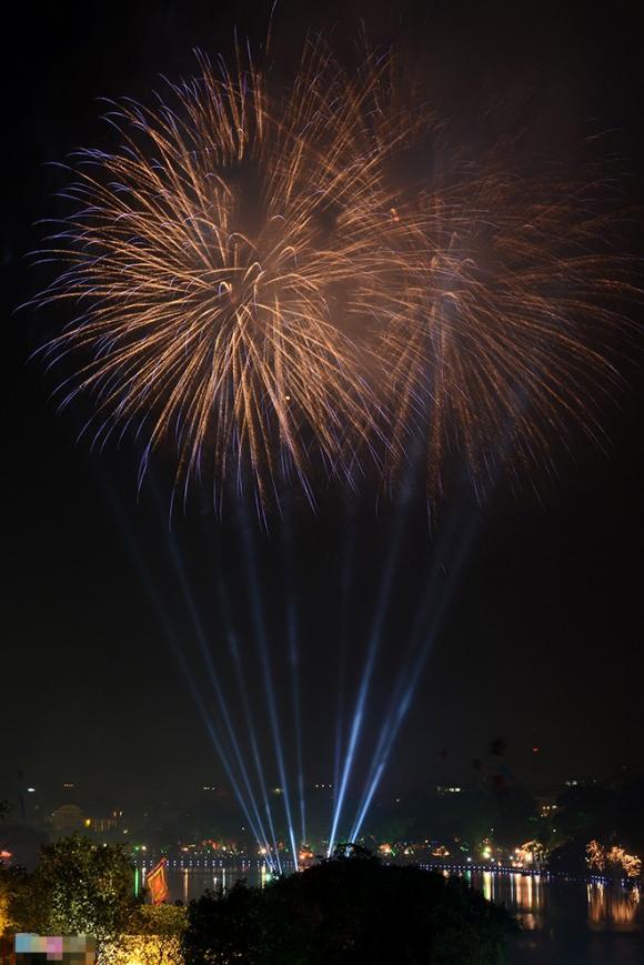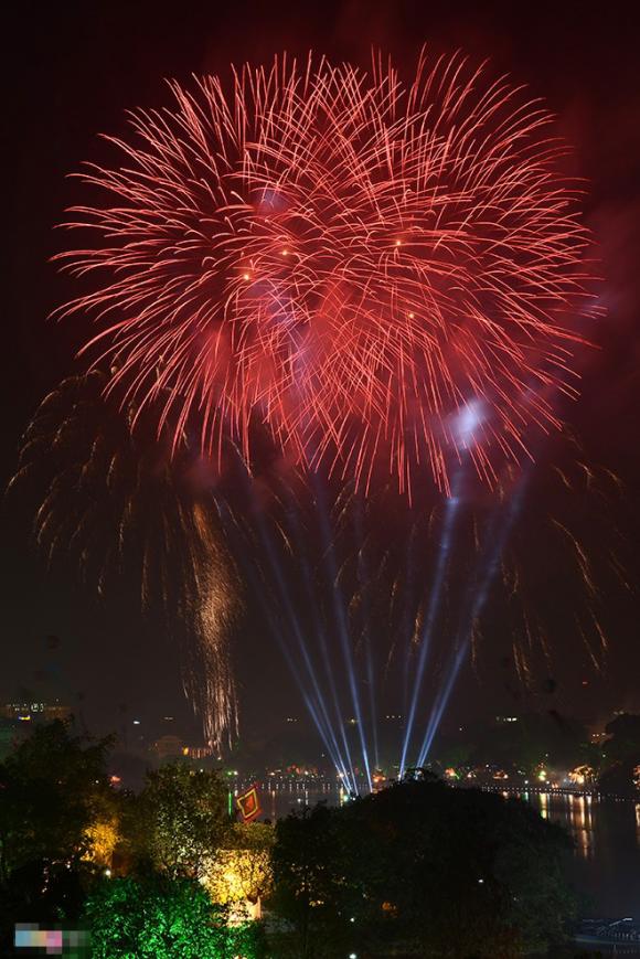 Pháo được bắn lên chụm lại ở khu vực giữa hồ kết hợp cùng ánh sáng laser khiến cho những chùm hoa sáng rực trên bầu trời.