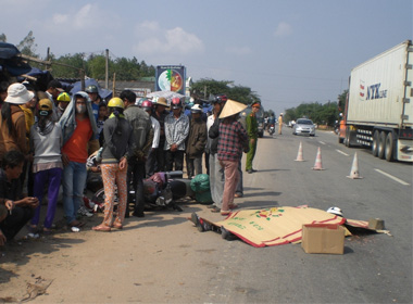 Ông Trần Triều (SN 1967, ngụ xã Phổ Cường, huyện Đức Phổ) kể: khoảng 9h sáng nay, 23/1, ông đi xe máy BKS 76F2- 2906, chở vợ là bà Phạm Thị Thúy Hồng (SN 1971) từ Đà Nẵng về quê ăn Tết. Khi đến đoạn đường trên bỗng dưng xe ông chao đảo rồi ngã. Cùng lúc đó xe đầu kéo BKS 75C- 01496, kéo container BKS 75R- 00047 đi cùng chiều cán lên làm vợ ông chết tại chỗ, ông Triều bị thương nặng ở chân.