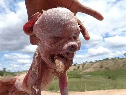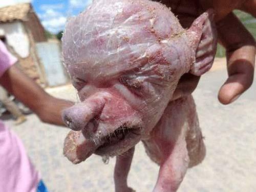 Một chú lợn con đột biến khi sinh ra mang khuôn mặt giống người trông rất đáng sợ tại thị trấn Tapiraipe, Brazil.