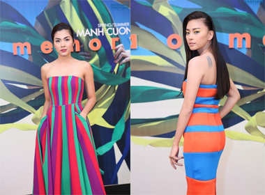 Xanh tím, cam, vàng là ba sắc màu kẻ sọc tôn làn da nâu gợi cảm của người đẹp Hương Giang.