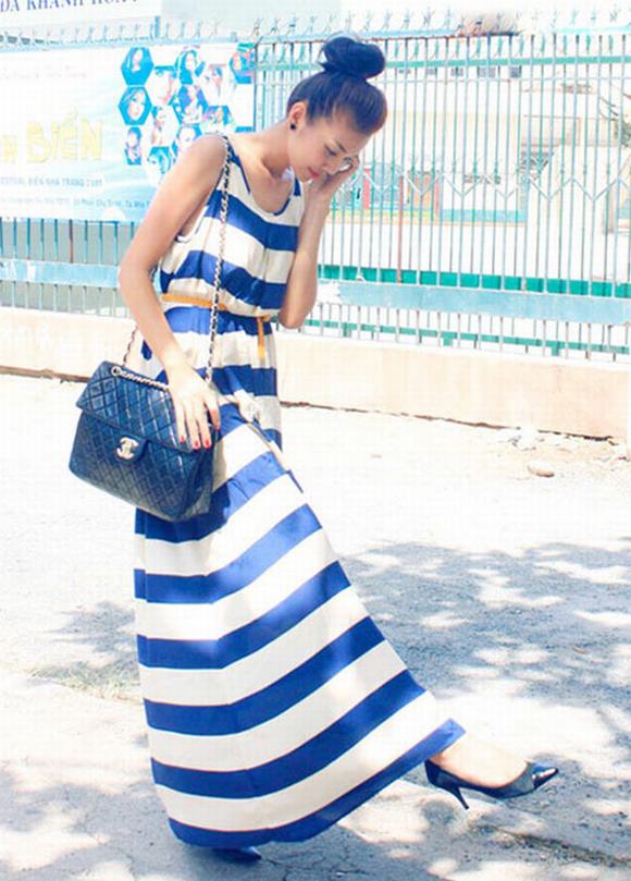 Họa tiết kẻ ngang, kẻ sọc tương đối phổ biến trong thời trang. Nếu như kẻ ngang có hiệu quả tôn đường cong tròn trịa của nữ giới thì kẻ dọc tạo hiệu ứng thị giác cao hơn, thanh thoát hơn cho người mặc. Trang phục dạo phố và sự kiện của sao Việt hạng A thời gian gần đây là sự trở lại mạnh mẽ của những họa tiết kẻ này trên tông màu cơ bản đen-trắng hoặc color block. Hè về đừng ngần ngại chọn cho mình những bộ váy kẻ bởi bạn có thể mặc hoài qua nhiều năm mà không sợ lỗi mốt.