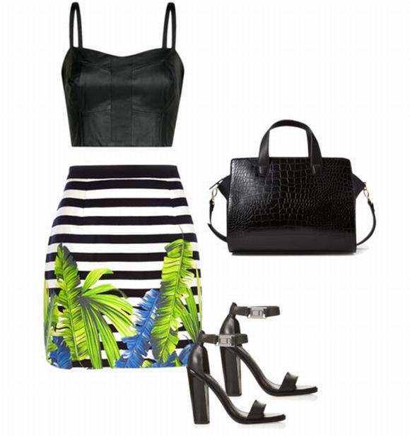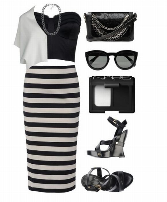 Váy kẻ dạng áo crop top và chân váy bút chì ôm sát gợi cảm.