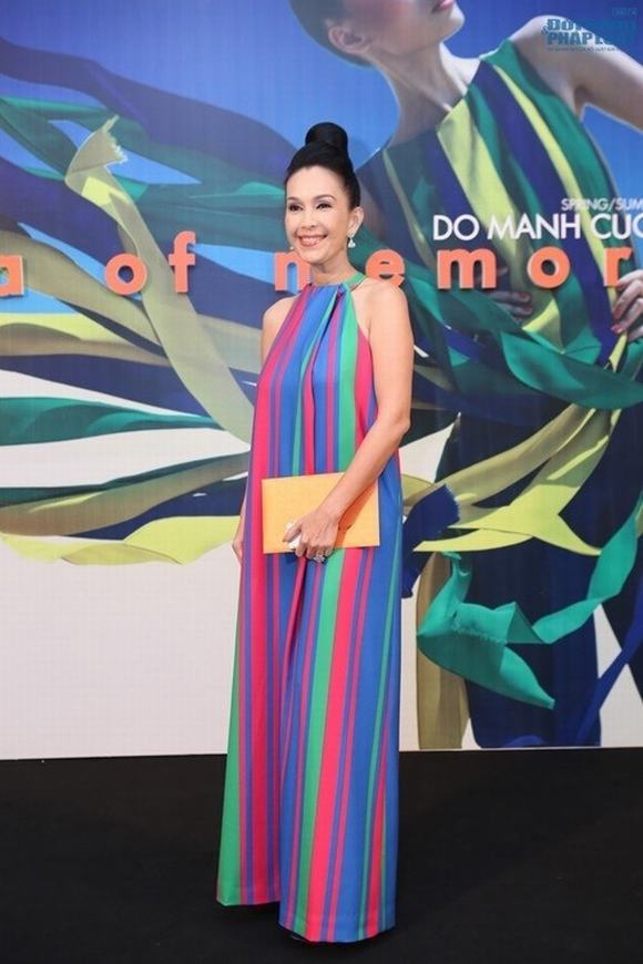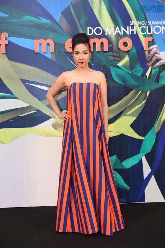 Diva Mỹ Linh ăn gian chiều cao đáng kể khi diện mẫu đầm kẻ sọc cam tím của nhà thiết kế Đỗ Mạnh Cường.