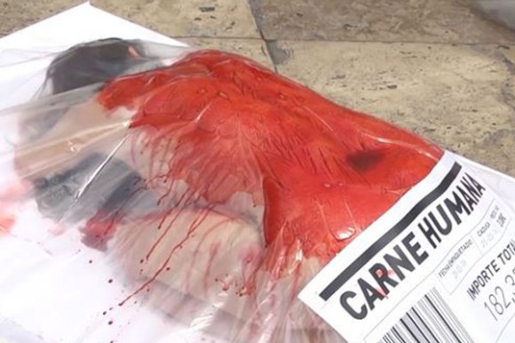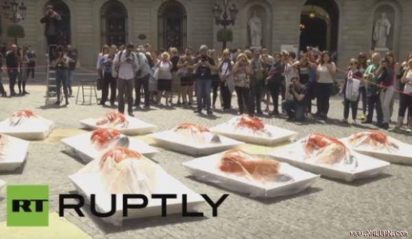 Những người trong một tổ chức bảo vệ động vật có tên là AnimaNaturalis đã tự tưới máu giả lên người mình, sau đó quấn nilon vào như những gói thịt người ta hay bán trong siêu thị.